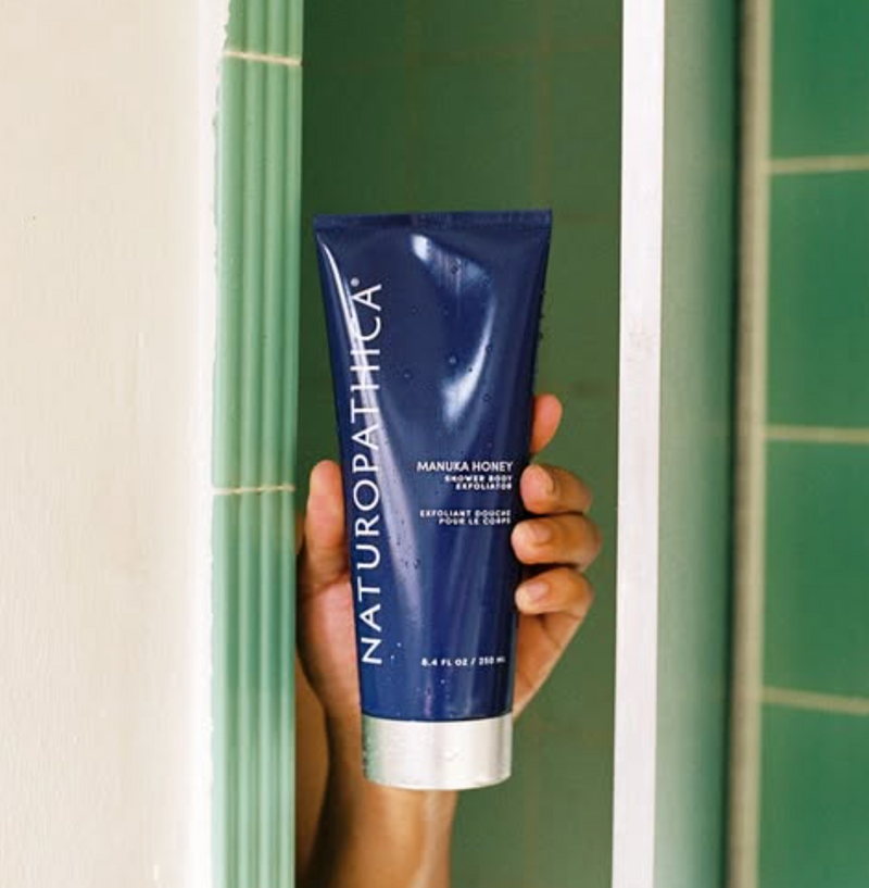 While showering, using the palm of your hand, massage Manuka Honey Shower Body Exfoliator into moist skin in circular motions. To exfoliate your entire body, use 0.5 oz - 1oz. of product. (That’s half a shot glass - a full shot glass.) Either rinse immediately or, for a deeper exfoliation, leave on for 3-5 minutes. After exfoliating, rinse and follow with an application of your favorite Naturopathica Body Lotion.